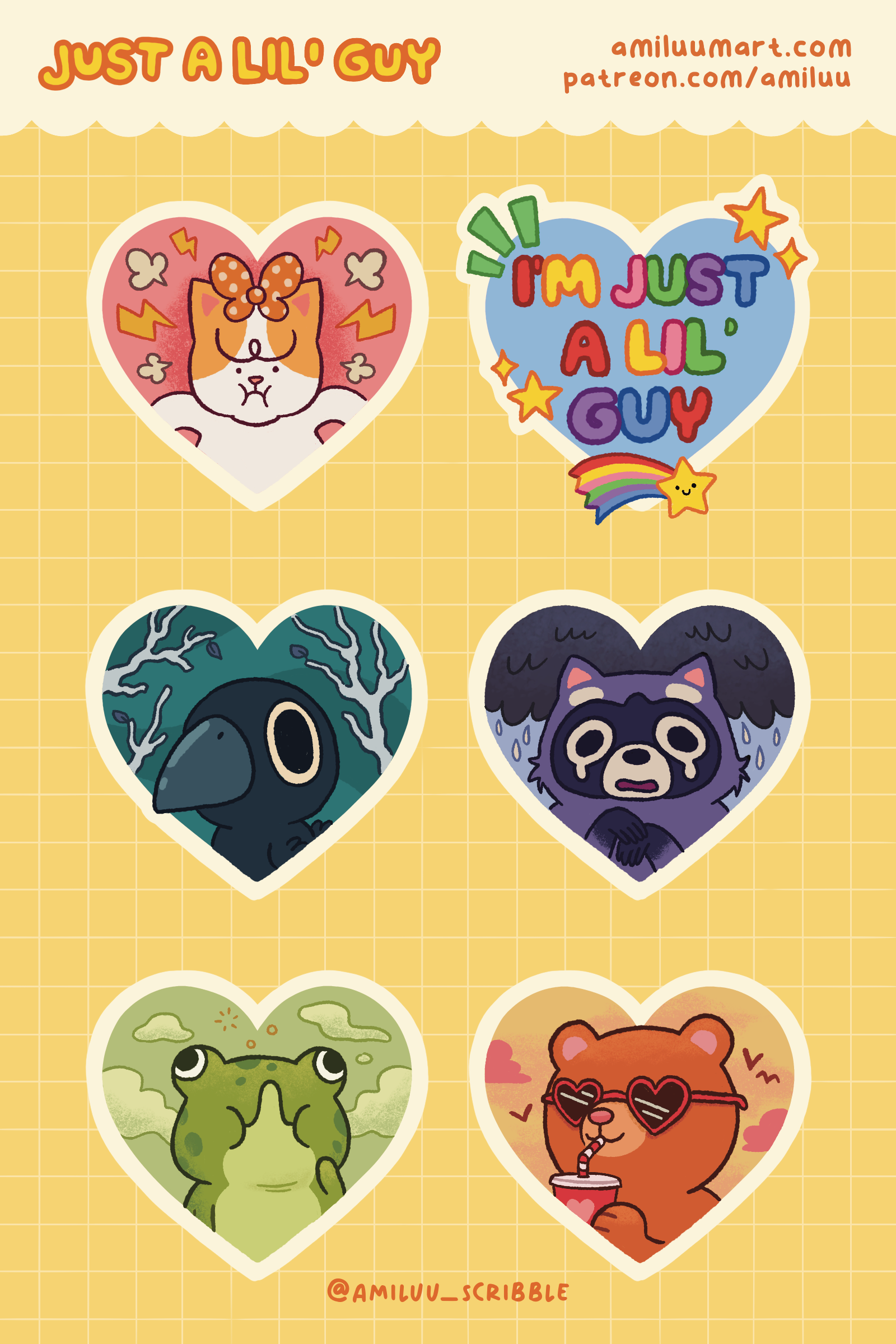 A bright and colourful sticker sheet with 6 adorable stickers. The stickers include my cast of original OC's, which I'm currently dubbing "lil' guys", plus an embellished text sticker that says "I'm just a lil guy".